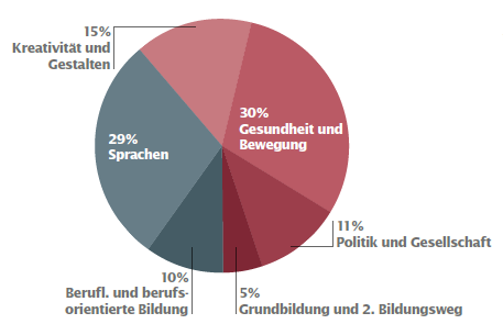 Besonders populär sind Sprachkurse und Kurse zu Gesundheit und Bewegung, die jeweils von knapp 9.000 Personen besucht wurden. Zu Kreativität und Gestalten sowie rund um Grundbildung und berufliche Bildung bildeten sich jeweils knapp 4.500 Personen weiter. Kurse zu Politik und Gesellschaft wurden schließlich von etwa 3.200 Personen in Anspruch genommen.